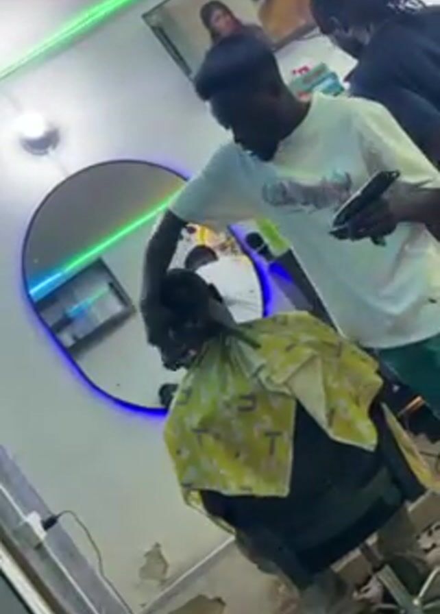 Inside a brightly lit barber shop, a young, dark-skinned barber with short hair, wearing a white t-shirt, stands cutting a client's hair