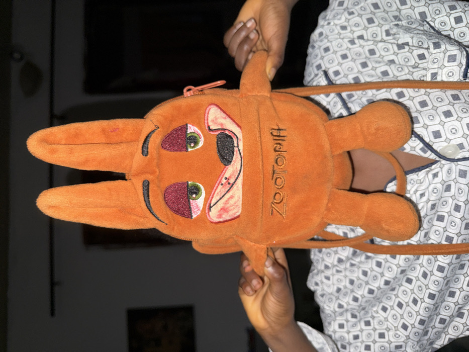 - "An individual is depicted indoors in Ado, Nigeria, holding an orange plush bag designed as the character Nick Wilde from Disney's Zootopia" by FM-ddIDX2, licensed under CC BY 4.0