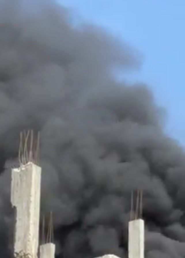 thick, black smoke billowing from what appears to be a partially-constructed building, with bare concrete supports visible