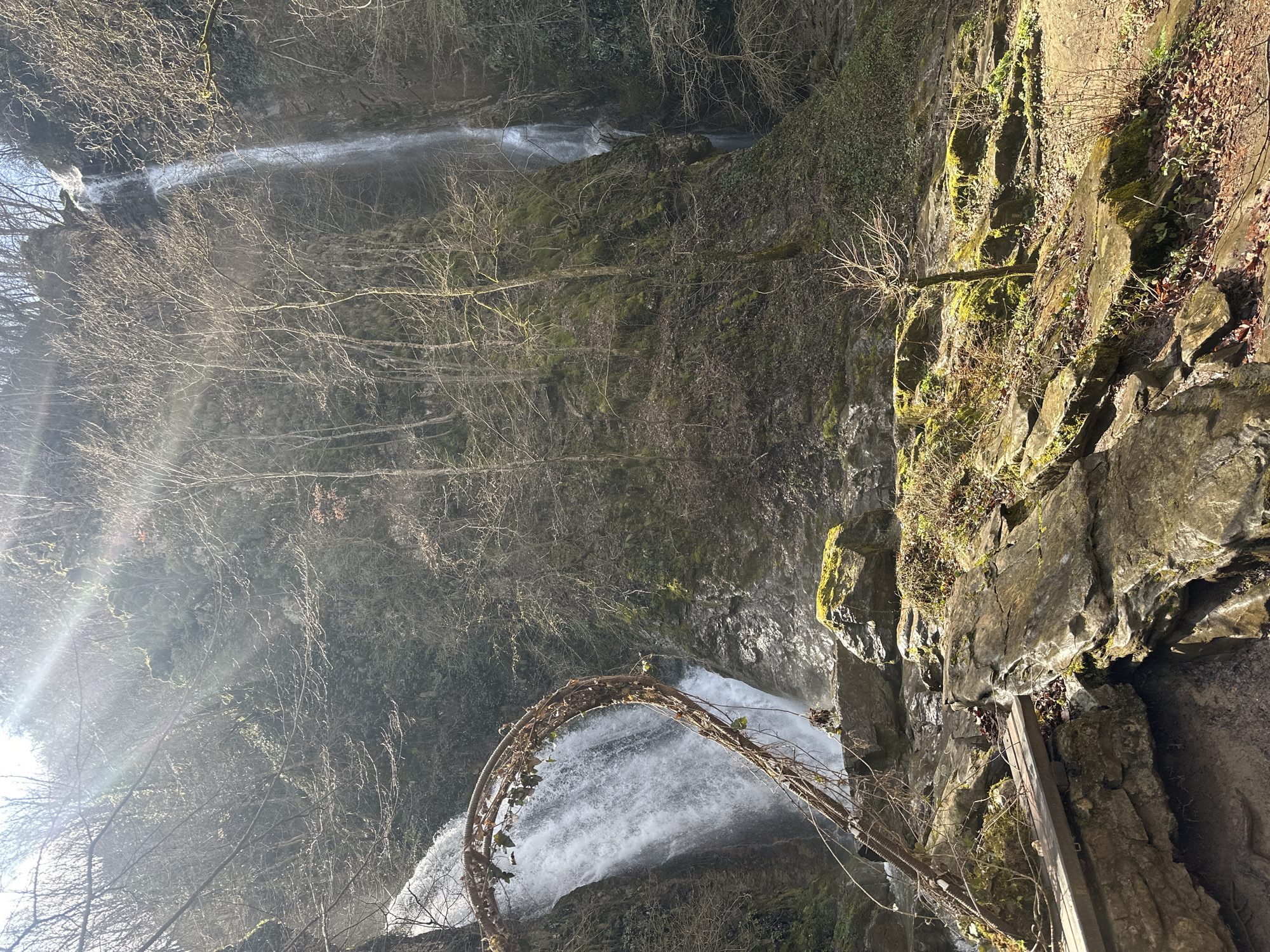 The image captures a waterfall in Teteven, Bulgaria. The waterfall cascades down a rocky cliff face covered in moss and vegetation. A natural archway of branches frames the lower portion of the waterfall. Sunlight filters through the surrounding trees, creating a bright and ethereal atmosphere. A wooden boardwalk or path is visible along the right side of the frame, constructed into the cliff, indicating a maintained trail for viewing the falls. Bare trees without foliage are prevalent in the background.