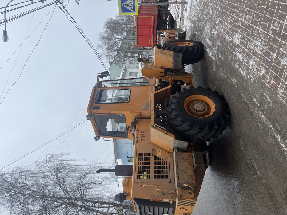 This image captures an urban street scene in Klin, Russia, under an overcast sky, indicating cool or cold weather. The foreground features a large, dirty orange Amkodor 332B wheel loader, positioned facing slightly right. The loader has a prominent cab with multiple roof-mounted work lights, a visible exhaust stack, and heavy-duty, knobby tires. Its surfaces are coated with grime or mud. To the right and slightly behind the loader, a red dump truck is partially visible, with a small pile of snow or white material adjacent to its front. The loader's bucket is lowered, resting near the ground. The ground immediately around the vehicles consists of a wet asphalt road, with a brick-patterned sidewalk running along the right edge of the frame. The sidewalk shows patches of residual snow and ice. In the mid-ground, several multi-story buildings are visible across the street, one prominently featuring a light blue facade. Bare deciduous trees stand along the street, their branches devoid of leaves. Overhead, a complex network of power lines and a street lamp are visible against the pale sky. A blue and white pedestrian crossing sign is partially visible on the right side, behind the loader. No people are present in the frame.