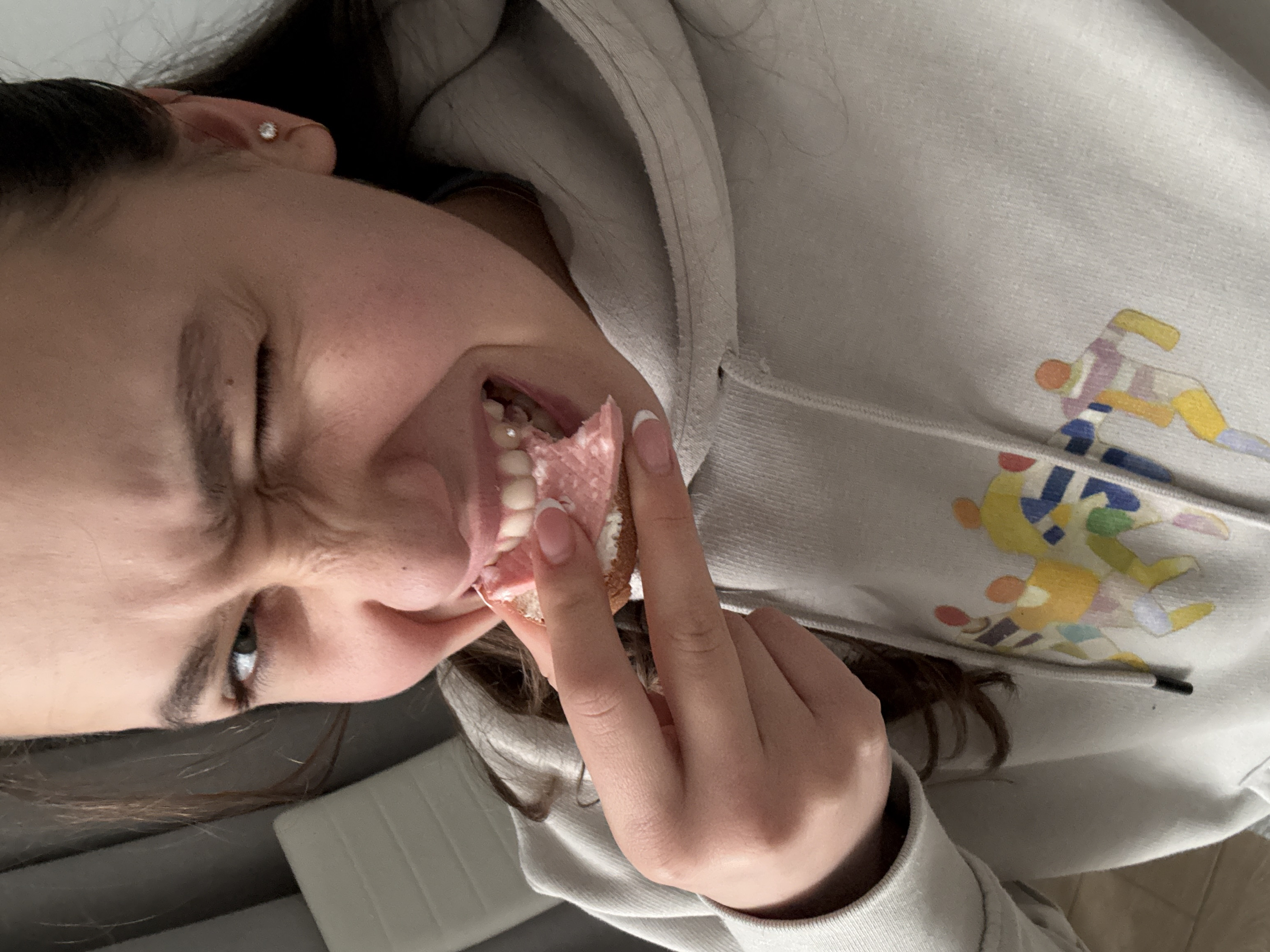 A young female is prominently featured in a close-up shot, positioned indoors. She displays an expressive facial contortion, characterized by a winking right eye, a furrowed brow, and an open mouth. She is in the act of biting into a small piece of bread spread with a pink substance. Her right hand, adorned with manicured nails, holds this food item near her mouth. She wears a light-toned hooded sweatshirt with a distinctive multicolored graphic depicting abstract human figures across the chest. A single stud earring is visible in her right earlobe. The background is out of focus, revealing a dark vertical surface on the left and a light-colored, horizontally textured surface, possibly a chair or cushion, to the right.