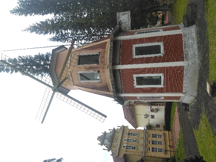 The image displays an outdoor scene set in Santa Cruz, Mexico, featuring a decorative, multi-story windmill structure in the foreground. The windmill occupies the right-center, presenting a cylindrical lower section constructed from red brick with vertical white columns and a grey concrete base. This section features two rectangular, white-framed windows. Above, an octagonal, tapered upper section, painted in a faded peach or light brown hue, contains two additional white-framed windows. A grey concrete ledge protrudes from the right side of this upper section. Atop the windmill, four green-grey, grid-patterned blades are affixed, oriented approximately at 10, 2, 4, and 8 o'clock positions. To the left and slightly behind the windmill stands a large, multi-story building exhibiting ornate European architectural characteristics. It is light yellow/beige with intricate white decorative trim, including elaborate gables and multiple multi-paned windows. Further in the background, a smaller, yellow building with a red-tiled roof is visible, featuring two exterior air conditioning units on its facade. The ground consists of green grass patches and dark grey/black irregular paving. A section of reddish-brown paving is visible between the ornate building and the main pathway. Several tall, slender conifer trees with dark green foliage dominate the background, particularly to the right of the windmill. The sky is uniformly overcast and white. No individuals or discernible actions are present in the scene. Small, dark fragments are scattered on the ground near the base of the windmill.