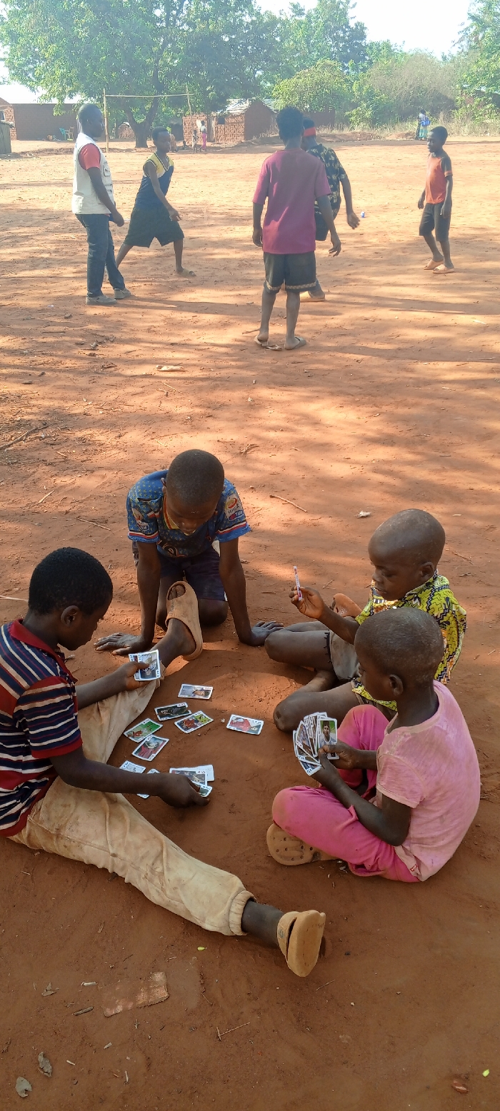 The image depicts an outdoor scene in Ngalula, Democratic Republic of the Congo, under bright daylight. The foreground features four children seated directly on reddish-brown dirt ground, engaged in playing cards. From left to right: a child in a striped shirt and light brown pants holds cards and observes cards spread on the ground; a child kneeling in a blue patterned shirt and dark shorts looks down at the scattered cards, wearing light brown slides; a child in a yellow/green patterned shirt holds a small red-tipped pen or marker; and a child in a pink t-shirt and pink pants holds a fan of cards, wearing light brown Crocs-style footwear. Numerous cards, featuring images of people, are laid out on the dirt between these children. In the mid-ground and background, approximately five other individuals, primarily older children or young adults, are standing or walking on the same dirt surface. From left to right: one individual in a white vest over a red shirt and dark pants; one individual in a blue and yellow tank top and dark shorts; two individuals with their backs partially to the camera, wearing a maroon shirt and a dark patterned shirt respectively; and one child in an orange t-shirt and dark shorts walking rightwards, wearing light brown slides. Behind these individuals, a rudimentary metal goal frame is visible. The background consists of sparse green trees and bushes, and several small, simple structures resembling houses or huts made of local materials with dark roofs. The ground is uniformly reddish-brown dirt, with shadows indicating direct sunlight.