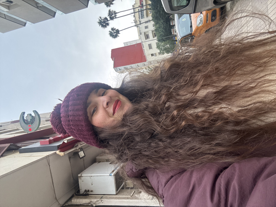 This image captures a selfie of a female individual on a city street in Meknes, Morocco, under an overcast sky