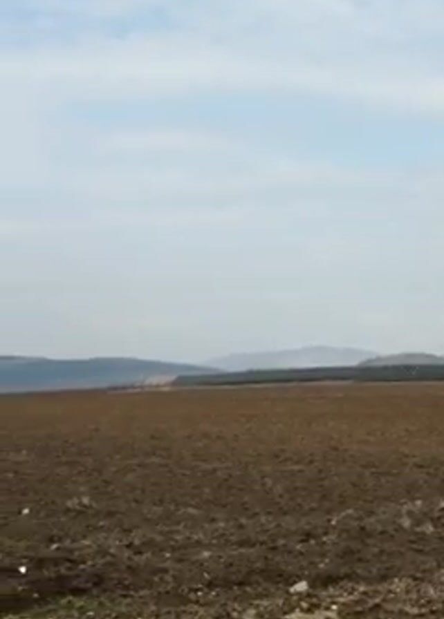 rural landscape on a cloudy day. In the foreground is a plowed field of dark brown soil. In the distance, a line of trees and hills can be seen, partially obscured by haze. The camera slowly pans upward, revealing more of the field and the distant landscape. The ground in the immediate foreground shows some scattered patches of grass and dirt. The sky is mostly overcast, with patches of blue visible between the clouds. Music plays in the background.