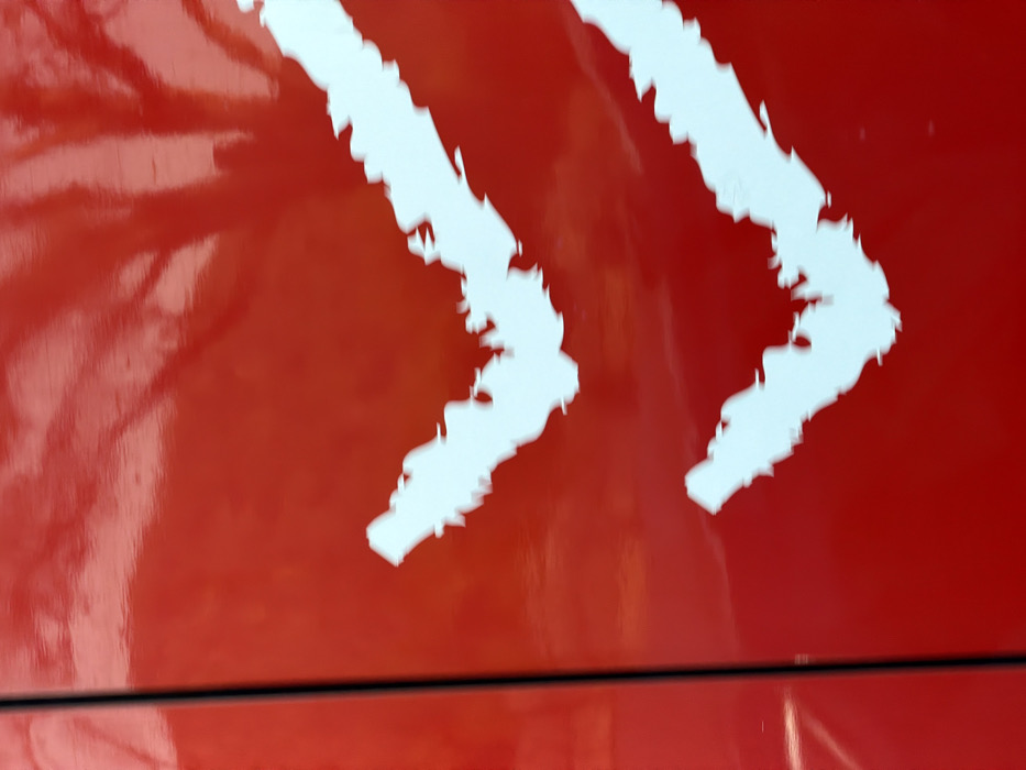 A close-up reveals two stylized, jagged white arrows pointing right against a glossy red background. The background is somewhat reflective, showing blurry reflections. The arrows appear slightly distressed, with uneven edges that give them a rough, almost torn appearance. The bottom edge of the frame is bordered by a black line.