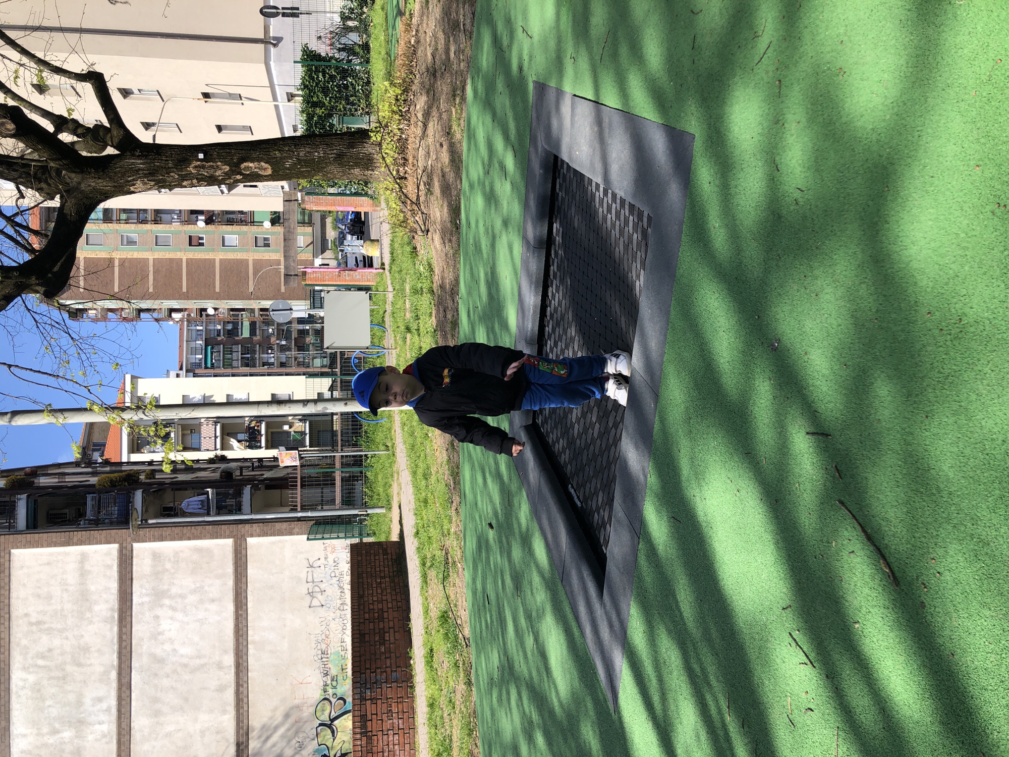 An outdoor scene in San Giuliano Milanese, Italy, on a clear, sunny day, depicts a young child on a playground trampoline. The child, appearing male, wears a blue baseball cap, a black hooded jacket with graphics on the left sleeve, blue jeans with colorful patches on the right leg, and white sneakers with black accents. He is standing centrally on an in-ground trampoline, which features a black textured bouncing surface bordered by a dark grey frame, set into a uniform green granulated safety surface. Long shadows from an unseen object or trees are cast diagonally across the green surface, which also has scattered small twigs and debris. In the midground, behind the child, a patch of grass separates the playground from urban elements. To the left, a low brick wall is heavily covered with graffiti, displaying various tags including "D$FK" and "WHITE." Beyond this wall, a multi-story residential building with a light-colored, possibly stucco, facade and visible balconies is present. To the right, a large deciduous tree with a thick, textured trunk and bare branches stands. Adjacent to the tree, a metal fence, partially obscured by green foliage, separates the playground from another multi-story residential building with a beige facade. A narrow passage with a pink-colored archway is visible between the tree and the building, leading to an area with several parked cars. Additional street furniture, including a streetlamp and various signs, are visible in the midground. The background consists of multiple multi-story residential buildings, varying in architectural style, with brick, beige, and light-colored exteriors, all set against a clear blue sky.
