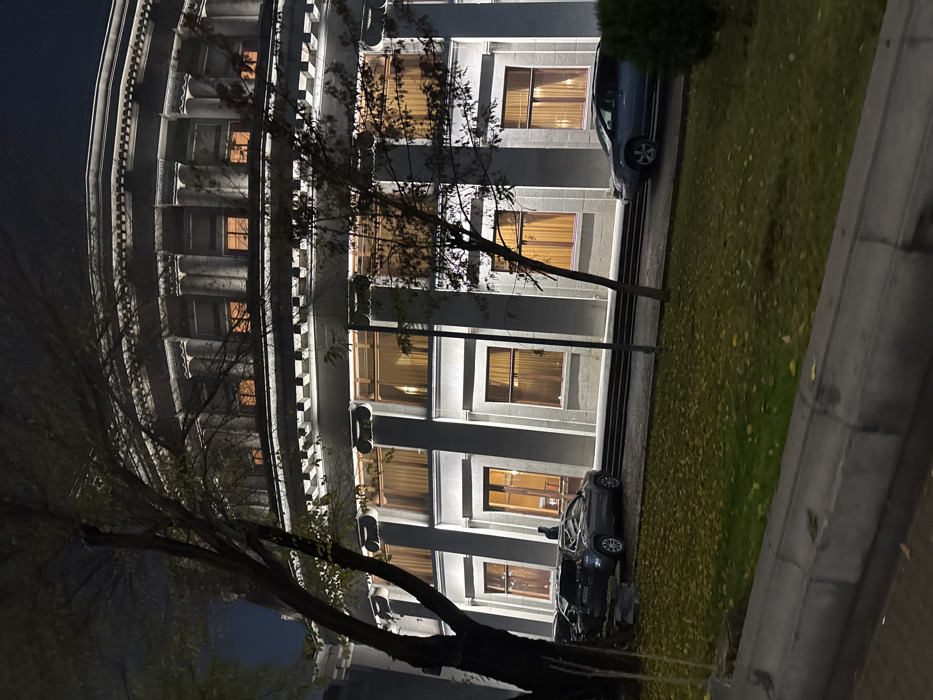 A nighttime exterior photograph depicts the Armenian National Academic Theatre of Opera and Ballet named after Alexander Spendiaryan in Yerevan, Armenia. The classical-style, multi-story building is externally illuminated by white accent lighting, highlighting its architectural features. The structure presents a prominent cylindrical upper tier with decorative columns and multiple arched windows, and a lower facade featuring columns and numerous rectangular windows. All visible windows are illuminated from within, revealing beige or orange-toned curtains. In the foreground, a grassy area is visible, sparsely covered with scattered brown and yellow autumn leaves. A gray concrete curb or barrier forms the bottom boundary of the scene. Bare tree branches partially obscure portions of the building. Two sport utility vehicles are parked on an asphalt surface adjacent to the building's steps: a dark-colored SUV is positioned on the left, while a lighter blue/gray SUV is parked further right. A single individual, dressed in dark attire, is standing or walking near the central main entrance of the building on the left side of the lower level.