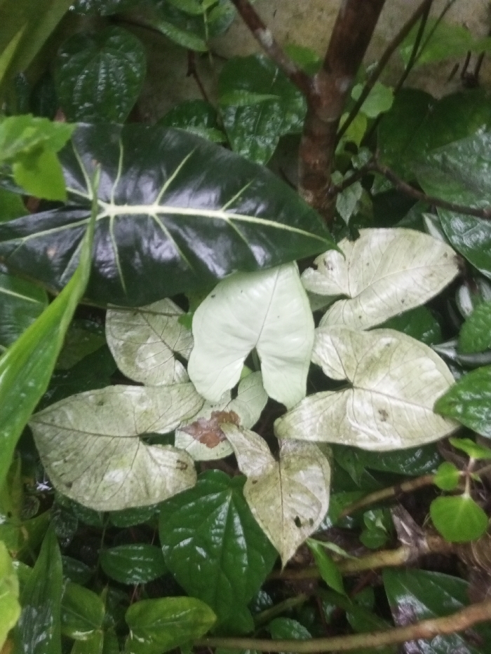 The image displays a close-up of dense, wet foliage located in Ura-Dozhi, Bhutan. A prominent dark green, ovate leaf with distinct light-colored veins occupies the upper left, exhibiting a glossy, wet surface. Below and to the right, a cluster of multiple pale green to whitish heart-shaped leaves are present, also appearing wet. Smaller, dark green, shiny leaves are interspersed throughout the frame. A brown, multi-branched stem or small tree trunk is visible vertically on the right side of the image. No individuals or active events are depicted.