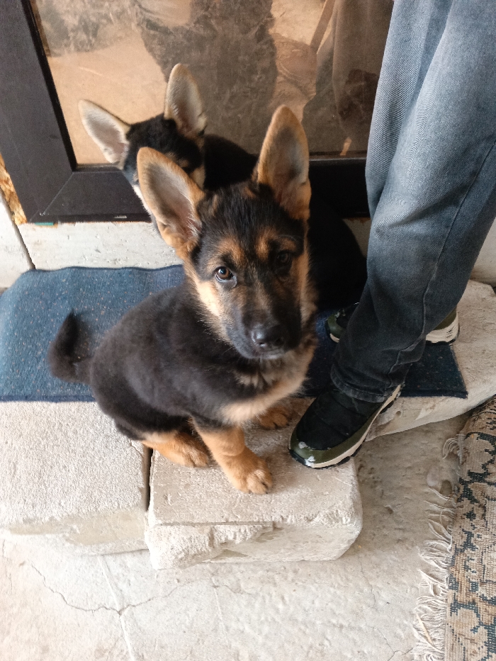 - "In Andreyevo, Russia, a black and tan German Shepherd puppy with erect ears is centered in the foreground, sitting on a light-colored masonry block and looking directly at the viewer" by FM-ln5U43, licensed under CC BY 4.0