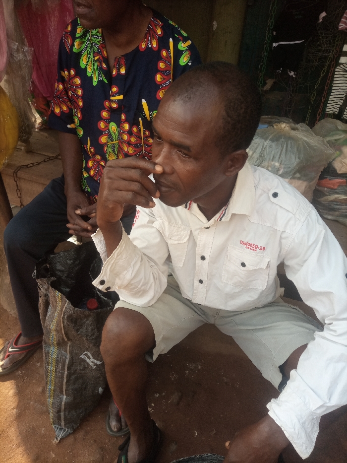 Two men sit closely. The man in the foreground wears a white button-down shirt with the inscription "Vision 50-20" and khaki shorts. He holds his hand to his face in a contemplative pose. The man behind wears a colorful print shirt. A bag with a visible "R" on its side rests near the front man. Both men wear sandals. The scene appears to be outdoors, with hints of chains and draped materials in the background. The lighting suggests it's daytime.