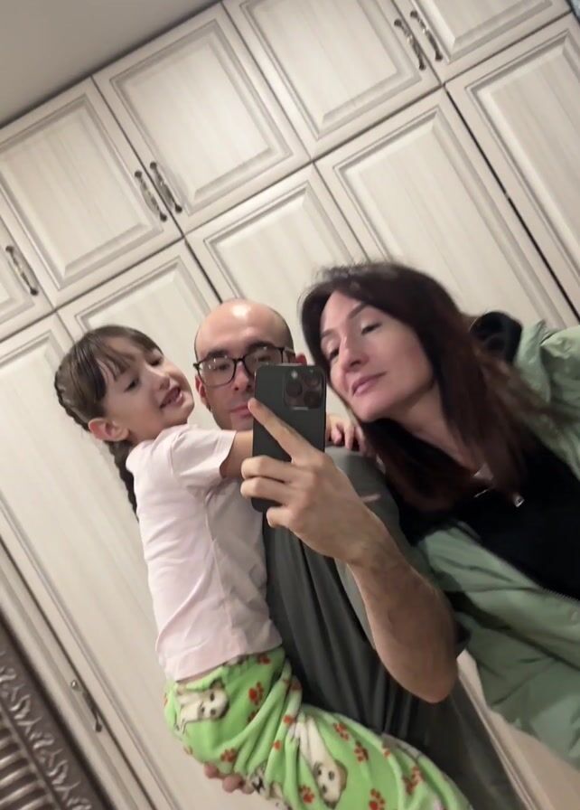A man, woman, and child pose for a selfie. The man, who is bald and wearing glasses, holds a dark smartphone in his right hand and holds the young girl in his left arm. She has brown hair in a braid and is wearing a light pink shirt and green patterned pajama pants. The woman, who has long brown hair, stands to the right of the man, wearing a green jacket over a black shirt. All three are smiling. Behind them are white cabinets with silver hardware. The floor is light wood. The camera shifts slightly during the recording, revealing the man is wearing grey shorts with three white stripes, and white socks. The camera moves again at the end, blurring the subjects.