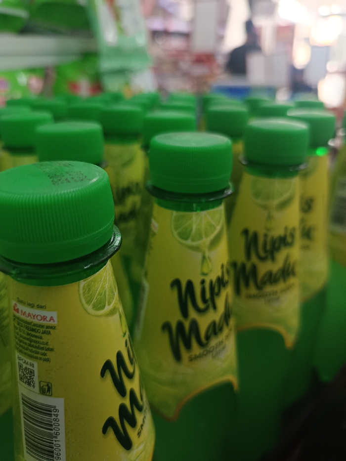 The image presents a close-up, slightly elevated perspective of multiple identical commercially packaged beverages arranged on a retail display within a store in Maleber, Indonesia. The primary subjects are rows of plastic bottles, each containing a pale yellow-green liquid and sealed with a bright green, ribbed screw cap. The bottle labels are predominantly yellow with black and green text, prominently featuring the brand "Nipis Madu Smooth Honey Lime" and a graphic of a sliced lime. The label on the foreground bottle on the left displays manufacturer information including "MAYORA" and "PT TIRTA FRESINDO JAYA", along with "Diproduksi di Indonesia," a barcode starting with "8996000," and a QR code. The bottles are upright, positioned within a green display tray or rack that extends into the foreground. The background is heavily blurred, indicating an indoor retail environment with indistinct shelving, various products, and a distant, dark, human-like silhouette. No direct human presence or active interactions are visible.