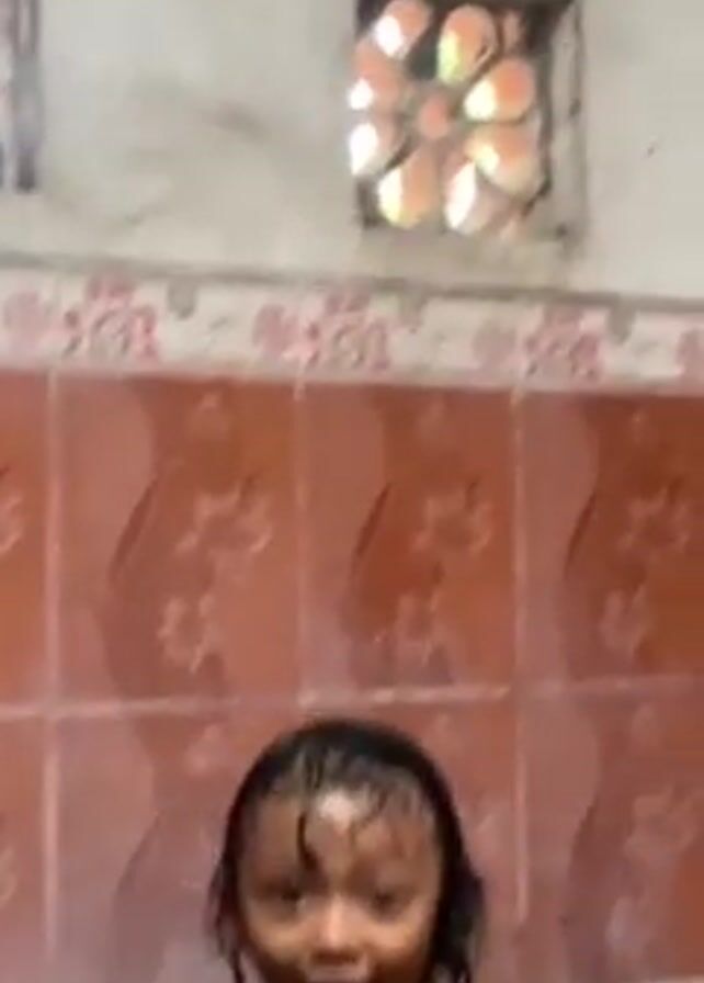 A young child with wet hair, standing in a tiled bathroom, pours water over their head from a grey plastic bucket. The child is smiling and laughing. The tiles are primarily brown, decorated with a floral pattern. A small decorative vent is visible near the top of the frame. The bathroom's walls are unfinished concrete.