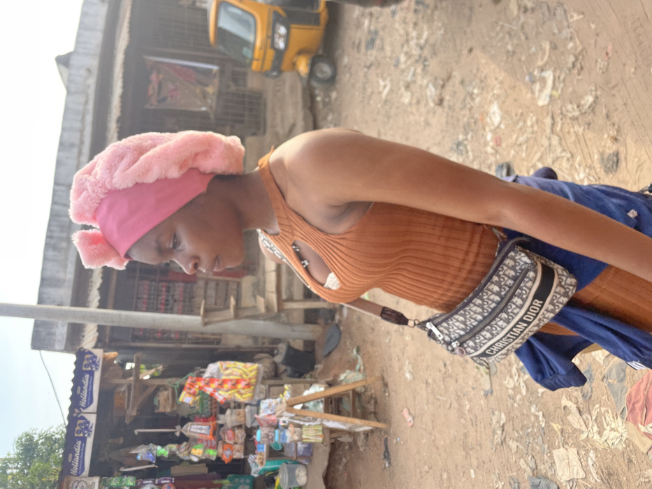 A woman with a pink fuzzy headwrap and a brown ribbed tank top stands on a dusty street next to a makeshift shop selling snacks and drinks. She wears a Dior crossbody bag. In the background, a yellow three-wheeled vehicle is visible. The setting appears to be a bustling, outdoor marketplace or roadside area.
