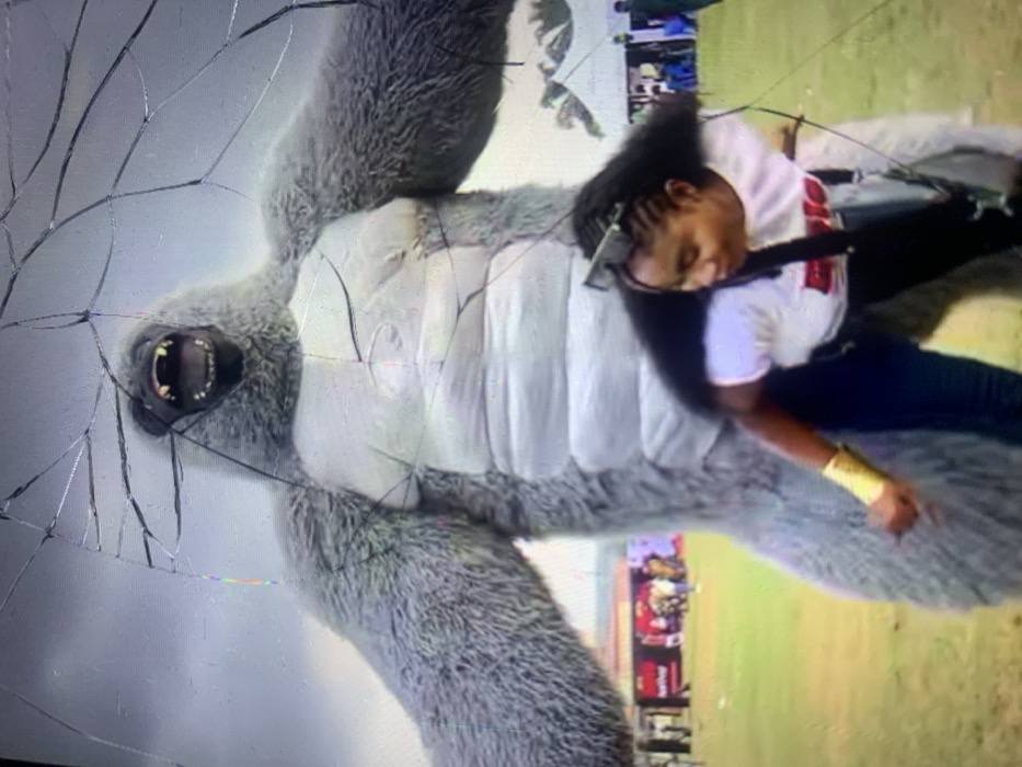 The image displays an outdoor scene in Ijegun, Nigeria, viewed through a cracked screen, evidenced by multiple radiating fracture lines overlaying the entire frame. The central subjects are a large, grey, gorilla-like figure and a woman. The gorilla figure, appearing to be a mascot costume or inflatable, stands prominently, facing forward with its mouth open in a roaring expression, revealing teeth and a dark oral cavity. It possesses grey fur-like texture on its arms and head, with a lighter, segmented abdomen. Its arms are extended outwards. In the lower right foreground, a woman with dark skin and braided hair is positioned to the left of the gorilla figure. She wears a white t-shirt, dark trousers, and has black sunglasses pushed onto her head. A golden arm cuff is visible on her right forearm. She is leaning slightly forward and to her right, away from the camera, with a faint smile, seemingly posing with or interacting with the large gorilla figure. A dark strap, possibly from a bag, crosses her chest diagonally. The environment consists of a green grassy field under a light grey sky. In the background, various white tents and red and white structures are visible, along with multiple individuals, suggesting an outdoor event or gathering. Distant foliage is also discernible.