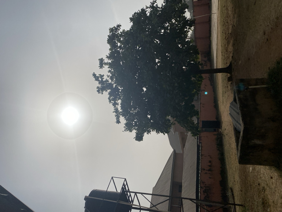 The scene depicts an outdoor compound under a bright, hazy sky in Kakuri Gwari, Nigeria. The sun, prominent in the upper-center, exhibits a distinct halo effect and lens flare. In the foreground, dry, light brown soil with sparse green vegetation covers the ground. A concrete block structure, possibly a wellhead or basin, with a partially covered opening, is located in the lower-left. A large tree with dense dark green foliage stands in the midground, slightly right of center. Behind the tree and foreground structure, a reddish-brown perimeter wall runs horizontally across the image. A dark metal door is set into this wall on the left. Beyond the wall, several residential-style buildings with sloped, dark grey corrugated roofs and light-colored walls are visible. On the far left, a black water tank on a metal support structure rises above the perimeter wall. No people are present, and no actions or interactions are observed. The environment suggests a functional, possibly institutional or residential, outdoor area during daylight hours.