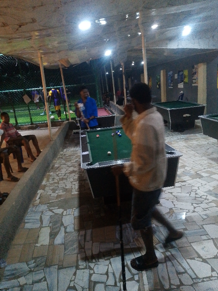 Under a covered patio with string lights, several people gather. One man, in the foreground, holds a pool cue and appears to be walking towards a pool table. Another man in a blue shirt stands by a different pool table, holding a cup. To the left of the pool tables, behind a chain-link fence, people are playing soccer on a lit field. A concrete bench lines the fence, with some people sitting on it. The patio floor is covered in a mosaic tile pattern.