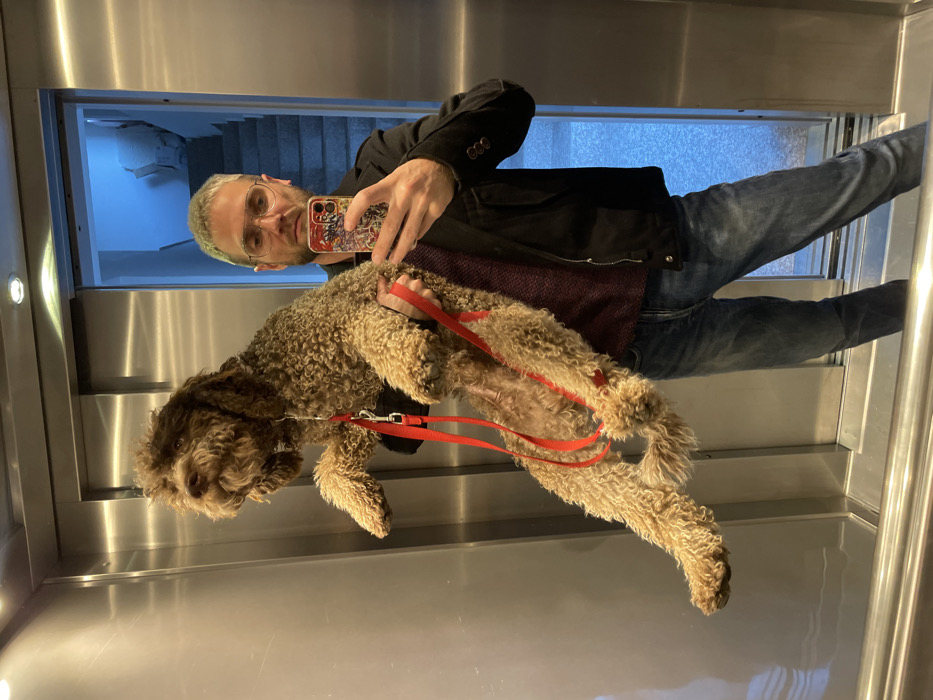 The image depicts a male individual and a dog inside a modern elevator with brushed stainless steel walls and door panels