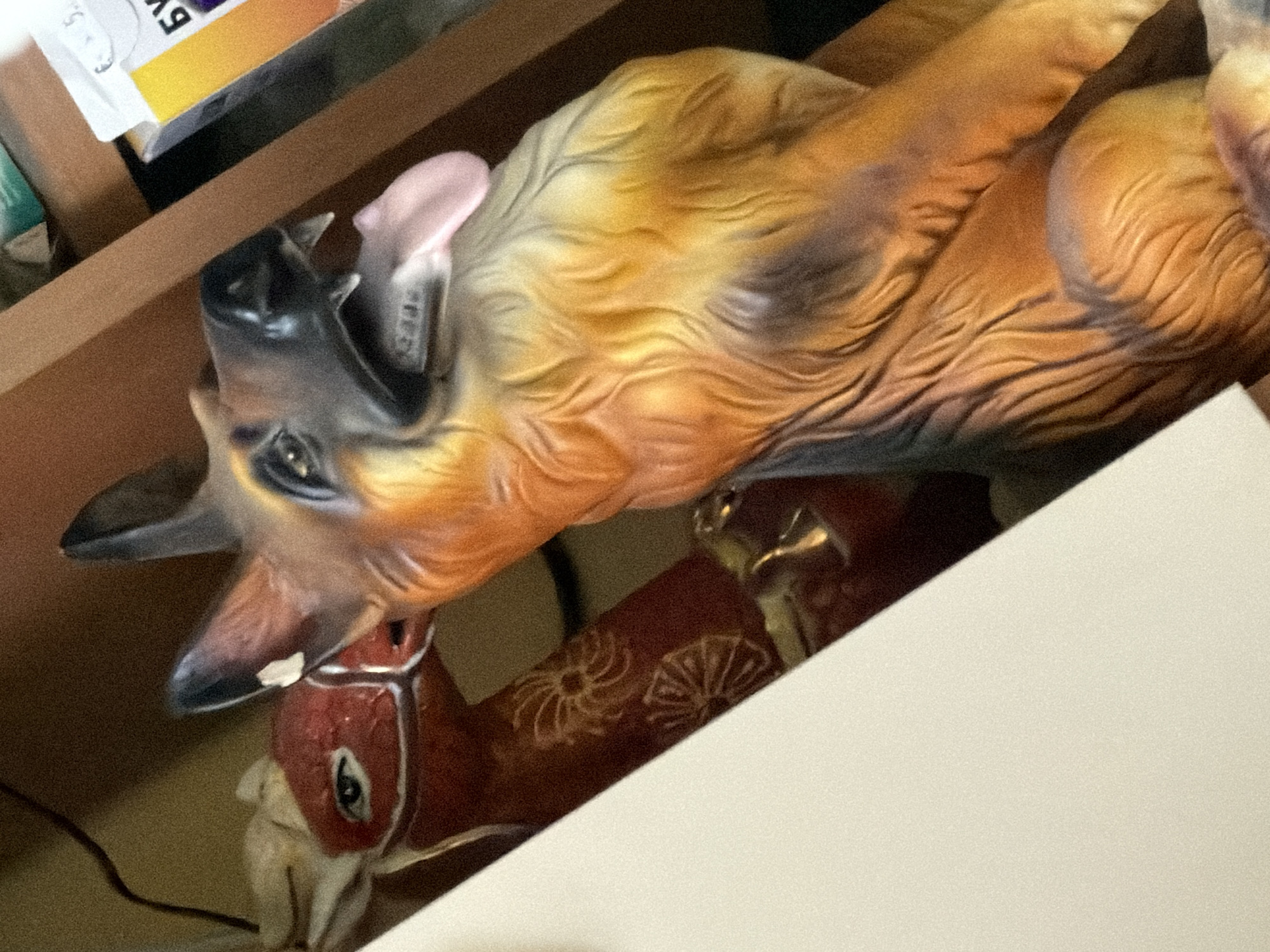 A close-up shot focuses on two figurines, one a German Shepherd and the other a reindeer, arranged on a shelf. The German Shepherd, positioned above the reindeer, has its mouth open, revealing painted teeth and a pink tongue. A tag is visible near its ear. The figurine has tan and brown tones. Beneath it, a smaller reindeer figure features a red body adorned with white spiral patterns. The background is cluttered with other objects. The scene is located in Chirpan, Bulgaria.