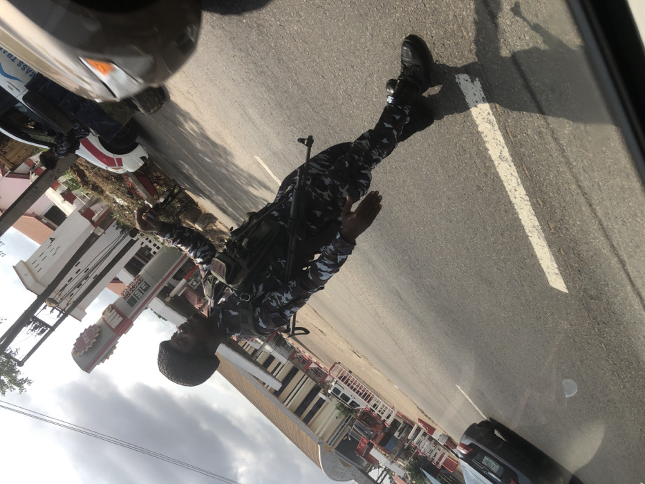 The scene depicts a daylight street view in Umuokpu, Owerri, Imo State, Nigeria. The primary subject is a male individual, appearing to be a security or police officer, standing in the middle of an asphalt road. He wears a blue-grey camouflage uniform, a tactical vest, dark boots, and a dark, possibly fur or wool, cap. An assault rifle, consistent with an AK-style weapon, is slung across his chest. He extends his right arm forward with an open palm, seemingly directing traffic or gesturing, while his left hand is positioned near the rifle. In the immediate background to the left, a "Gozzy Petroleum" petrol station is visible, identifiable by its distinctive red and white vertical sign displaying fuel prices and a large canopy structure. Further down the road, to the left, traffic cones and white barriers line the roadside, with a black sedan and other vehicles present. To the right of the primary subject, a white commercial shuttle bus or van with red stripes and partially visible blue lettering ("ASS TRA", likely "MASS TRANSPORT") is parked. Another individual, also in a similar camouflage uniform, is partially visible near the front of this vehicle. Behind the bus, a raised embankment or median separates the road from a building featuring white walls and a reddish-brown roof. The road surface is asphalt with a distinct white lane marking in the foreground. The sky is partly cloudy. The image appears to have been captured from inside a vehicle, through a window, as indicated by reflections and a partial obstruction in the lower right corner.