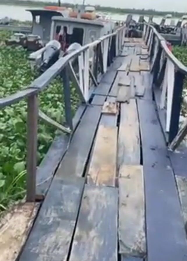 A first-person perspective video shows a person walking along a narrow, weathered wooden bridge with railings. The bridge is constructed from dark wood planks of varying sizes, some of which are broken or missing. On either side of the bridge, there is dense green vegetation, possibly water hyacinth. Several boats are visible in the background, partially obscured by the vegetation. The sky is overcast.