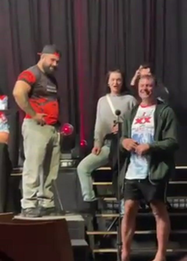 A medium shot captures three individuals standing on a stage. To the left, a man in a red and black t-shirt, gray work pants, a black cap, and sneakers stands casually with his hand on his hip, looking towards the other two. In the center, a woman with long, dark hair and a gray sweater and light blue jeans sits casually on the stairs, holding a phone. She is looking at the man to her right. To the right, an older man in a green jacket, a white t-shirt with colorful patterns, black shorts, and sandals stands with a microphone, gesturing as if speaking. Behind them, a red curtain hangs, and additional figures are visible on the stage in the background.