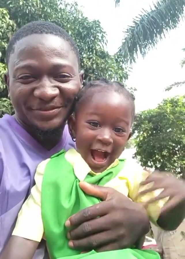 A man wearing a lavender-colored shirt is holding a young child, who is wearing a school uniform, in his arms. Both are smiling broadly at the camera. The background includes trees and foliage, suggesting an outdoor setting. The video appears to be taken at a close range. The overall atmosphere is joyful and candid.