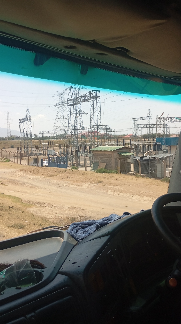 The image presents a daytime view from inside a vehicle, likely a truck or bus, looking forward through a tinted windshield. The lower portion of the frame shows the vehicle's dashboard, dark grey in color, with a portion of a steering wheel visible on the lower right. A crumpled blue towel rests on the dashboard towards the center-right. Beyond the vehicle, a large electrical substation or power plant is visible under a clear, bright sky, consistent with the Hells Gate ward in Kenya. Numerous tall, grey metal lattice transmission towers are distributed throughout the scene, supporting overhead power lines. Various electrical equipment, including insulators and transformers, are arranged on platforms within the substation's fenced perimeter. Several small, single-story buildings are present within the complex; one has a green corrugated metal roof and appears to be constructed of cinder blocks, while another is white with a flat roof, possibly a guardhouse near a blue gate. The ground surrounding the substation is predominantly dry, light brown earth, indicating an arid or semi-arid environment, with sparse, dry vegetation. Dirt roads and tracks crisscross the foreground and lead into the substation area. In the far distance, faint outlines of hills or mountains are visible under the horizon. No individuals or active movements are discernible in the scene. The overall impression is an industrial power infrastructure facility situated in a rural or developing area.