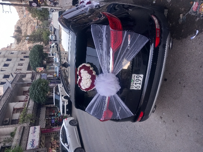A black Kia Sportage SUV, decorated as a wedding vehicle, is parked on an asphalt street in Munin, Syria
