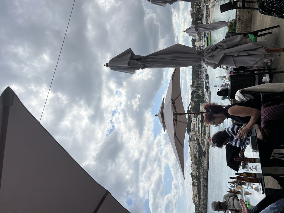 The scene depicts an outdoor dining or social area on a terrace overlooking the harbor of Porto Cristo, Spain. The sky is largely overcast with prominent cumulus clouds and visible patches of blue. A calm, blue-green body of water, likely a bay or inlet, occupies the midground, with a distant shoreline featuring light-colored buildings interspersed with green vegetation on a hillside. A marina filled with numerous moored boats and yachts is visible to the right, adjacent to a small breakwater with a red structure. In the foreground and midground, several outdoor umbrellas are present. One light-gray umbrella is fully open, providing shade over a central table. Two other large, light-gray umbrellas are closed and folded upright in the right midground, and a corner of a fourth open umbrella is visible in the upper left foreground. Four individuals are seated at a black rectangular table in the foreground. On the far left, an older male with gray hair, wearing sunglasses and a light-colored long-sleeved shirt, is seated with his left arm resting on the table. A hand and forearm, possibly belonging to another person, are visible to his right, gesturing over the table. Next, a female with dark, curly hair, wearing a striped long-sleeved shirt, looks down at a small object held in her hands. To her right, a female with reddish-brown hair tied in a ponytail, wearing glasses and a dark sleeveless top, looks towards her left. A purple/maroon jacket is draped over the back of her chair and partially covers her lap. On the foreground table, multiple dark glass bottles, some empty and some partially filled, are visible alongside clear drinking glasses and small electronic devices. A partially visible table to the right holds additional glassware, a clear bottle, and a dark box-like object. The individuals are seated, engaging with items on the table and appearing to be in a social gathering.