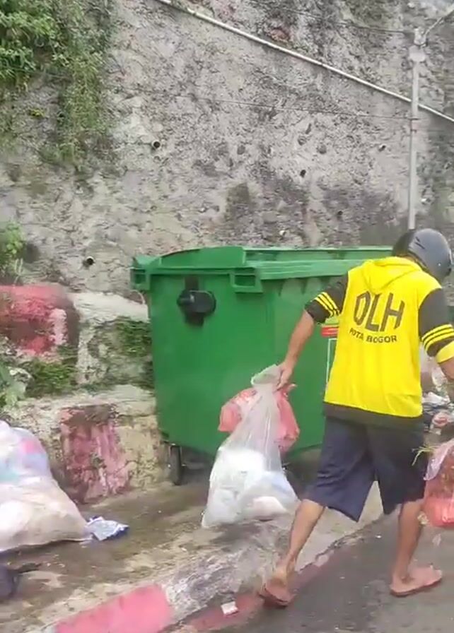 A man wearing a yellow jacket with "OLH DT. BOGOR" printed on the back, dark shorts, and sandals carries two plastic bags of trash uphill on a street lined with green trash bins. The road is next to a stone wall with plants growing on it, and a sidewalk with a red and white curb. Overhead power lines are visible against the sky. The man is walking away from the camera.