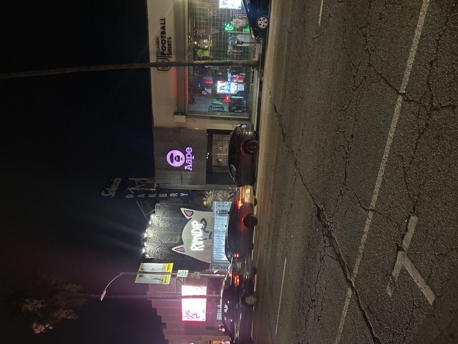 At night, a street scene is captured with several parked cars along the right side. Illuminated storefronts line the left, including "Aape," "Schwartz Bakery," and "Classic Football Shirts." A large mural featuring "RIPNDIP" is also visible. Streetlights and other signs contribute to the urban setting. The road surface is cracked and marked with white lines.