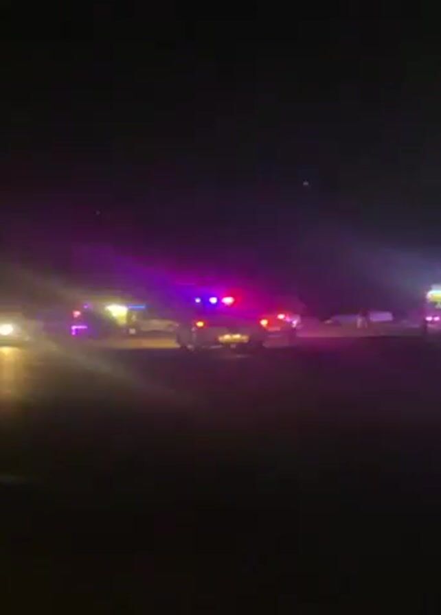 At night, a row of parked emergency vehicles is visible, flashing red and blue lights. They are parked in a flat, possibly paved, area. Dark silhouettes of people are visible on the left side of the frame.