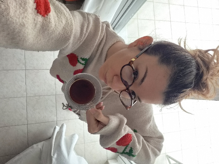 A female individual with dark brown hair styled in a messy bun and wearing brown, oval-framed eyeglasses with gold accents is captured from a high, overhead angle. She wears a cream-colored textured sweater featuring red cherry motifs with green stems on the sleeves and torso, along with a thin gold-colored necklace. Her right hand extends forward, holding a clear glass cup with a silver-colored, ribbed rim, containing a dark reddish-brown liquid. Her gaze is directed towards the camera. The floor beneath her consists of light-colored square tiles. The background is predominantly bright white, suggesting strong ambient light or an outdoor view, with a dark horizontal line visible on the upper left, possibly a window or door frame. A partially obscured white, soft object is visible in the lower right background. The scene is located in the Municipal Unit of Corinth, Greece.