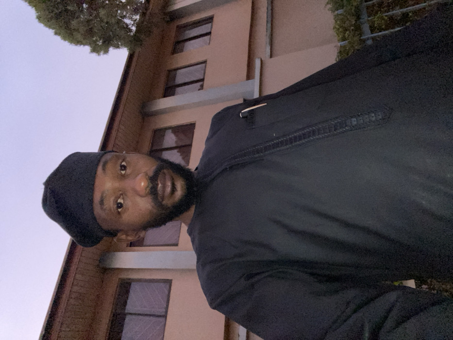 A dark-skinned person with a beard and wearing a black beret and a black jacket is centered in the frame