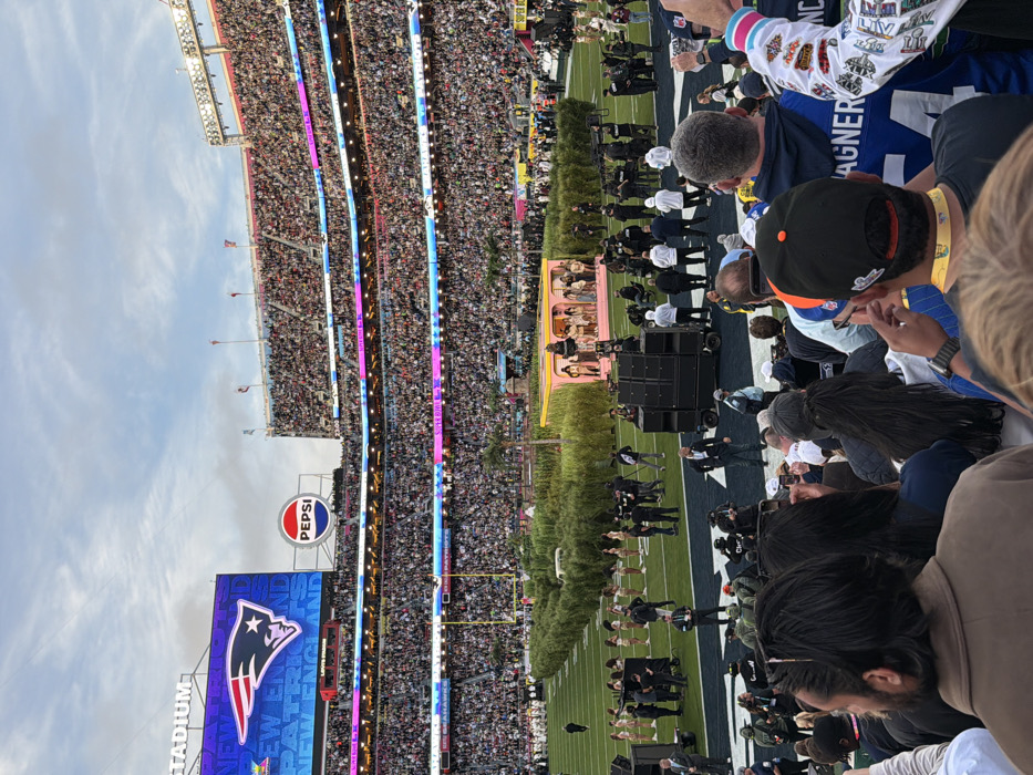 A densely packed stadium with spectators fills the frame. A large video screen shows the New England Patriots logo, and a Pepsi sign is visible. On the field, performers are on stage in front of tall green hedges and other performers are positioned on the field. The view is slightly obstructed by other spectators in the foreground.