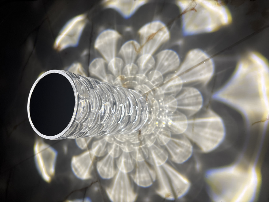A clear textured tube, possibly glass or plastic, casts a complex light pattern on a dark surface