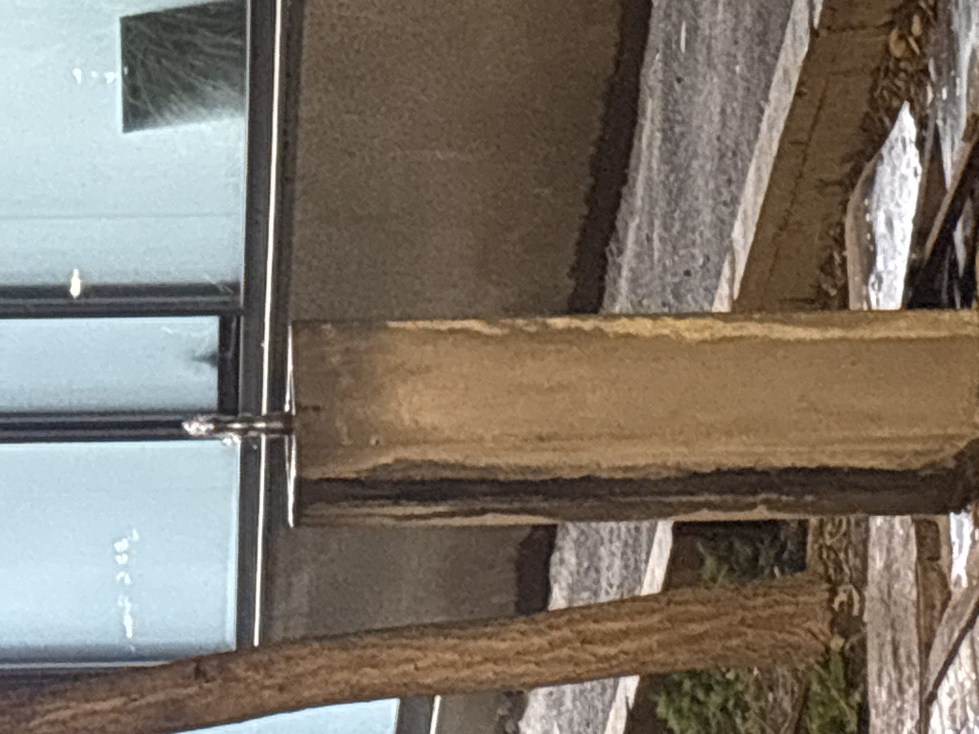 close-up view of a building and part of a wooden structure. A window with a black frame is visible, reflecting an indiscernible scene. To the right, a concrete or stone wall is present. A rough-hewn wooden beam runs horizontally across the foreground, with a smaller wooden element intersecting it. The background shows other parts of the wooden structure and hints of foliage. The location is Unknown, Unknown.