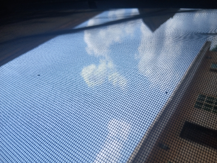 The scene depicts an exterior view captured through a dark mesh window screen, located in Ota, Nigeria. The screen, forming a grid pattern, covers the majority of the frame, with several minute dark specks visible on its surface. Beyond the screen, a clear blue sky with dispersed white cumulus clouds is present. In the lower-left quadrant, a light-colored building with a visible roofline and architectural details, including window openings, is discernible through the mesh. The right edge of the frame shows a dark, vertical structure, consistent with a window frame or a drawn curtain/blind. The environment indicates daytime illumination. No individuals are present.