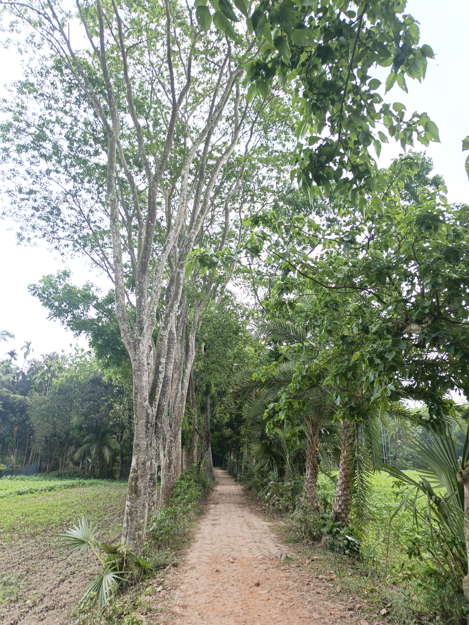 dirt road stretching into the distance, lined with tall, thin trees on the left and denser foliage on the right. The trees on the left have light gray bark with numerous branches reaching upwards. The trees on the right are a mix of species including palm trees and trees with broad green leaves. A field is visible to the left of the road, and beyond that lies a thicket of green trees. The sky is overcast. The location is likely in a rural area, possibly in Muladi, Bangladesh. No people are visible in the scene. The road appears to be unused.