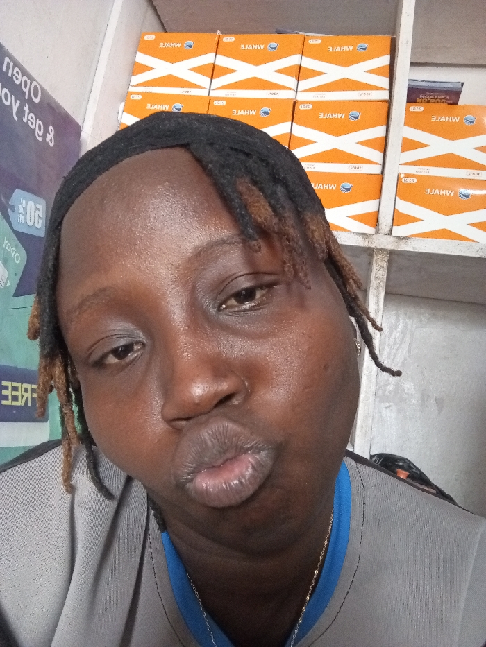 The image displays a close-up frontal portrait of an individual in Fagge A, Nigeria. The subject is a dark-skinned female with black dreadlocks, some featuring lighter brown tips, framing her face. She is looking directly at the camera with her lips pursed forward in a pronounced "kissy face" expression. Her eyes are open and directed at the lens. She wears a grey upper garment over a visible blue collar, and a thin, light-colored chain is present around her neck. A small earring is visible in her right ear. The background on the left features a partial, vertically oriented sign or poster with reversed text including "nepo" (open) and "EERF" (FREE) on green and light blue sections. The background on the right shows multiple shelves stacked with numerous orange boxes, each featuring a white 'X' design. Reversed text "EWLAM" (WHALE) and "102S" (5201) are partially legible on these boxes. The environment appears to be an indoor retail or storage space.