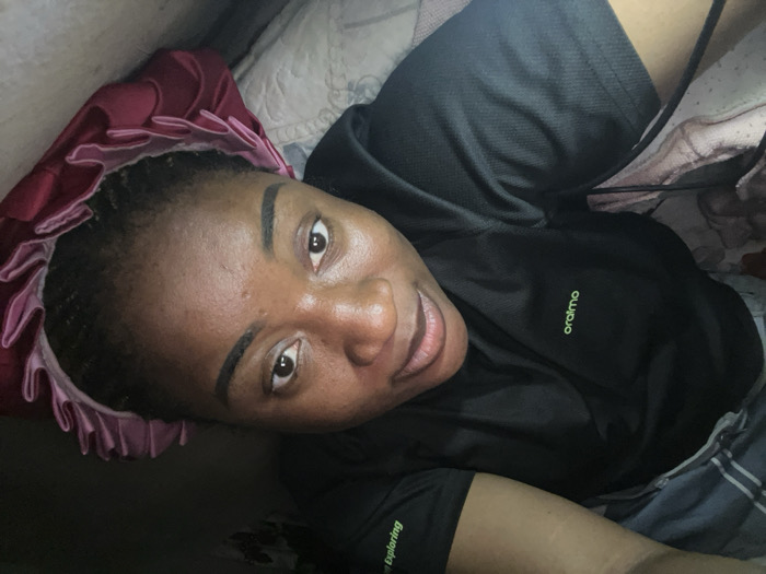 A woman with dark skin and brown eyes looks up at the camera. She wears a pink bonnet with frills around the edges. Her dark hair is visible at the hairline. She is wearing a black athletic shirt with a green logo on the left side of the chest. The shirt has short sleeves. She is lying on what appears to be a bed with a patterned sheet underneath her.