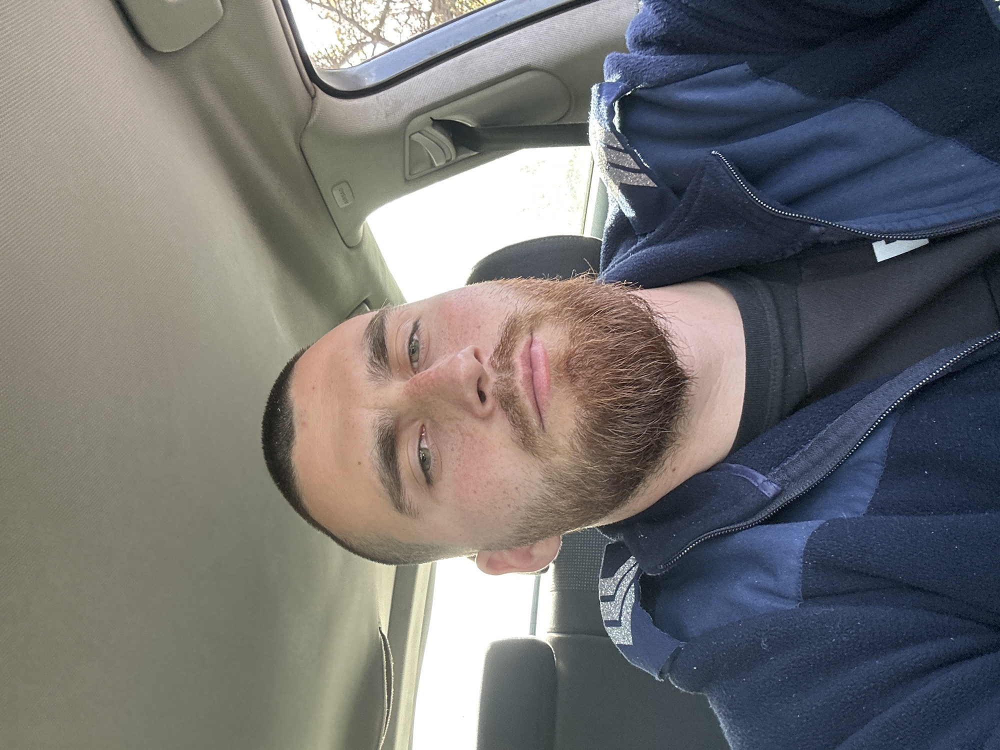 A selfie image shows a Caucasian male with short dark hair and a ginger beard, inside a vehicle