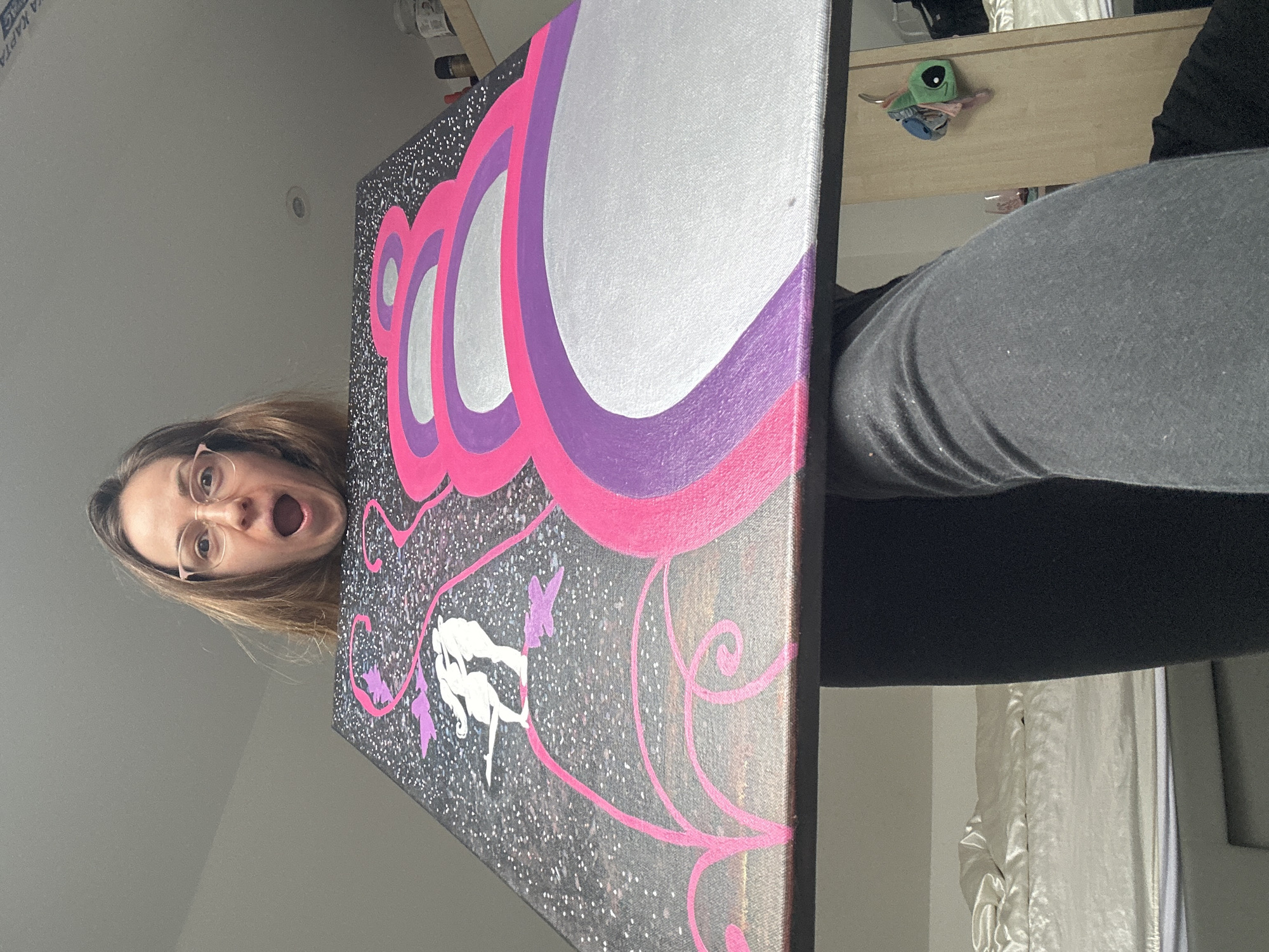 A female individual is depicted holding a large painting in a residential room, likely an apartment or house located in Reading, United Kingdom. She is positioned behind the painting, with her head and upper torso visible. Her expression features wide eyes and an open, 'O'-shaped mouth. She has shoulder-length brown hair and wears light-framed glasses. The painting, a rectangular canvas, displays a dark, speckled background reminiscent of a starry night sky. On the left side of the artwork, two white silhouette figures, appearing to be a man and a woman embracing or dancing, stand on a pink, winding vine-like structure with smaller pink accents. The right side of the painting features several large, concentric, curved bands in shades of pink, purple, and silver. The room's background includes a bed with light-colored, possibly satin, bedding to the left. To the right, a light-colored wooden wardrobe is visible, with a hook holding a small green alien-like plush toy and other small objects. A shelf above the wardrobe holds various containers. The ceiling is plain white with a single recessed downlight.