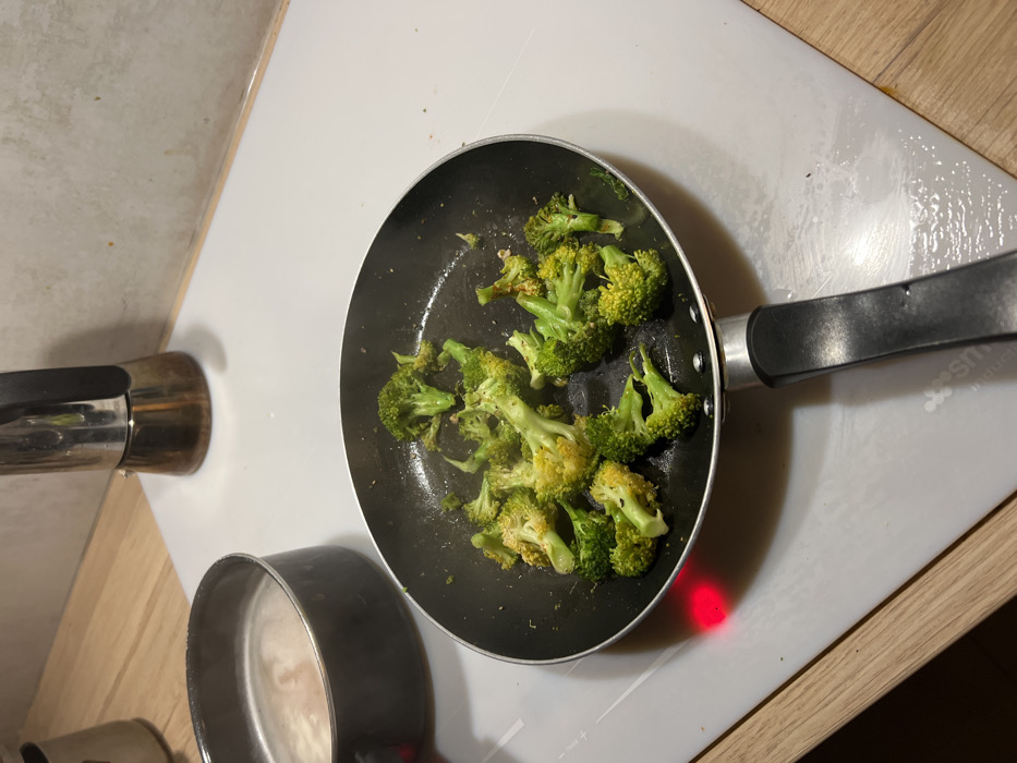 An overhead view of a kitchen counter in Paris, France, shows food preparation in progress. A black non-stick frying pan occupies the center-right, containing numerous vibrant green broccoli florets, some exhibiting slight browning from cooking. A red glow emanates from below the pan, indicating an active heating element on the white induction stovetop. To the left, a black saucepan holds a light-colored, possibly boiling or simmering, liquid with a foamy surface. In the background, a silver-toned Moka pot stands near a light-colored tiled backsplash. The stovetop features a partially visible "SMEG" logo. Wooden countertops flank the cooking area. No individuals are visible.