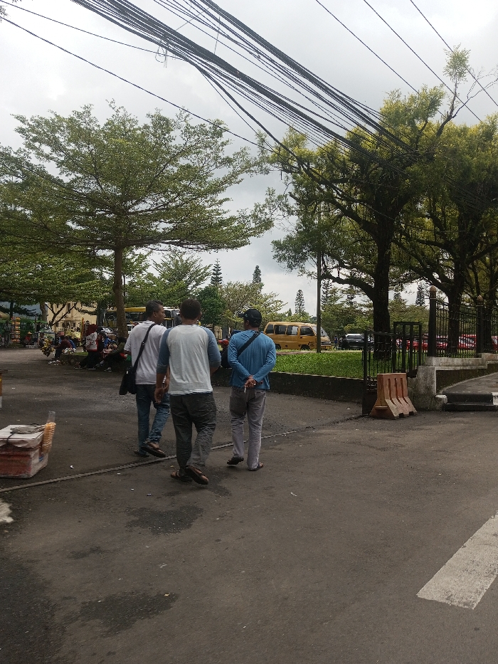 Three men walk on an asphalt road in front of a park. The man in the middle wears a white shirt with gray sleeves, while the other two wear white and blue shirts, respectively. Lush green trees line the park behind them. A yellow van is parked further in the background. Overhead, numerous power lines crisscross the sky. A white line is seen on the right side of the frame.