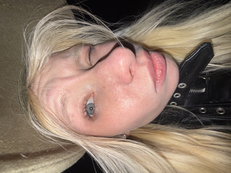 A close-up, rotated view captures a fair-skinned individual with platinum blonde hair. One blue eye is visible, partially closed. The subject's nose is prominent, and their lips appear full. They wear a black leather jacket with metallic eyelet details and a zipper. Part of a tan-colored, textured surface appears at the bottom left. The background is dark.