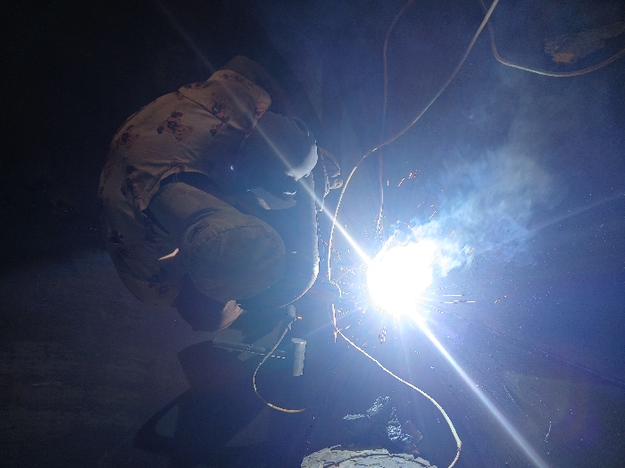 A welder is captured from above, crouching and engulfed in the bright arc of welding